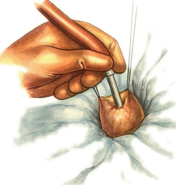 Если желчный пузырь сморщен или расположен так, что его невозможно подвести к передней брюшной стенке, то производят холецистостомию на протяжении. Вначале тщательно фиксируют дренаж кисетными швами к