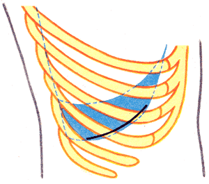 Разрез Кохера начинают от срединной линии и проводят на 3—4 см ниже и параллельно реберной дуге; длина его 15—20 см.