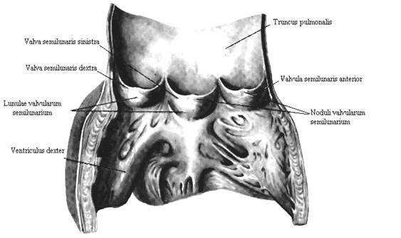 Отверстие легочного ствола, ostiumtrancipulmonalis, располагается впереди и слева, оно ведет в легочный ствол, truncuspulmonalis; к его краю прикрепляются образованные дупликатурой эндокарда три полулунных клапана: передний, правый и левый, valvulasemilunaressinistra, valvulasemilunaresanterior, valvulasemilunaresdextra, свободные их края выступают внутрь легочного ствола.