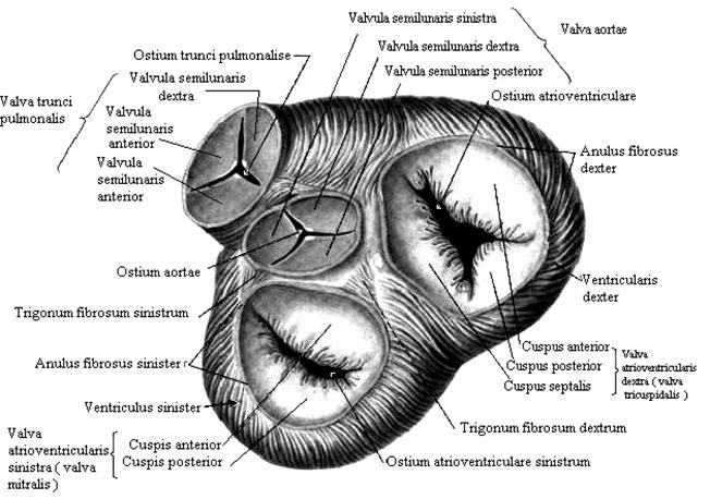 Из трех створок одна большая, перегородочная, створка, cuspisseptalis, располагается ближе к перегородке желудочков и прикрепляется к медиальной части правого предсердно-желудочкового отверстия. Задняя створка, cuspusposterior, меньшая по величине, прикрепляется к задне-наружиой периферии того же отверстия. Передняя створка, cuspusanterior, самая малая из всех трех створок, укрепляется у передней периферии этого же отверстия и обращенавсторону артериального конуса. Часто между перегородочной и задней створкой может располагаться небольшой добавочный зубец.