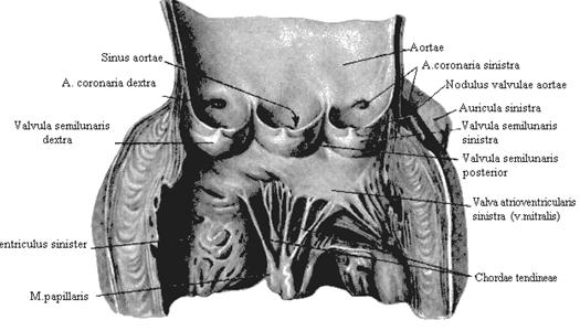 По окружности отверстия аорты прикрепляются три полулунных клапана аорты, которые соответственно своему положению в отверстии называются правым, левым и задним полулунными клапанами, valvulaesemilunaresdextra, sinistraetposterior. Все они вместе образуют клапан аорты, valva aortae.