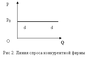 Спрос на продукт фирмы есть максимально возможный объем продаж этой фирмы (в единицах продукта) при некоторой установленной ею цене на свой продукт. Спрос на продукцию отдельной фирмы в условиях совершенной конкуренции абсолютно эластичен, кривая спроса – горизонтальная линия (рис.2).