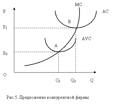 Если рыночная цена продукта меньше p1, то фирма прекращает производство, а ее предложение равно нулю. Если рыночная цена продукта лежит в пределах от p1 до p2, то фирма продолжает производство, но несет убытки. Если цена продукта больше p2, то фирма получает прибыль.