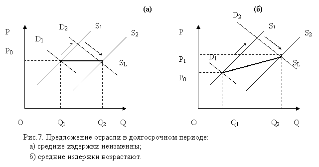 На рис.7(а) долгосрочная кривая предложения отрасли с неизменными издержками изображена жирной линией и обозначена SL. Через p0 обозначены минимальные долгосрочные средние издержки, через Q1 – отраслевой выпуск до увеличения рыночной цены, через Q2 – отраслевой выпуск после повышения рыночной цены.