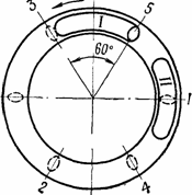 — переместить стрелку-указатель до ближайшего целого деления на шкале муфты, соединяющей двигатель с силовой передачей, разметить шкалу на шесть делений по 60° и пронумеровать их;