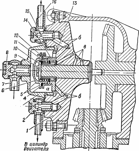 Рис. 4. Воздухораспределитель: 1- корпус воздухораспределителя; 2 и 8- зажимы; 3- колпак; 4- прокладка; 5- упорные шайбы; 6- крышка; 7 и 16- поворотные уголки; 9 и 12- штифты; 10- валик; 11- пружина; 13- регулировочная втулка; 14- распределительный валик; 15- прокладка; а- полость; б- воздушные каналы; в- смазочные отверстия.