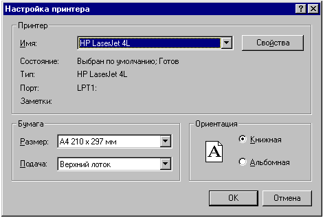 Подменю установка принтера предназначена для вызова стандартной формы выбора принтера (Рис. 7.4.).