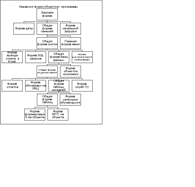 В программе используется более 28 форм для работы с таблицами базы данных и 7 вспомогательных форм для работы с печатью, помощью и отчетами. В виду такого количества форм необходимо составить иерархию форм (Рис 7.5.) для облегчения программирования и уменьшения требовательности к ресурсам ОС и аппаратным ресурсам.