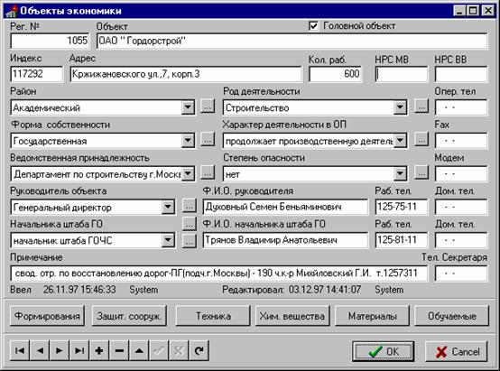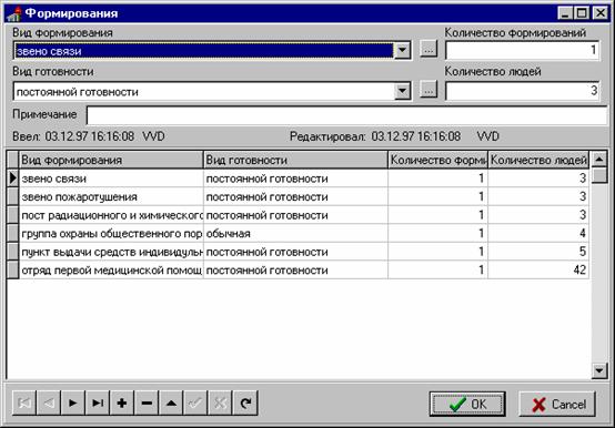 В качестве примера дополнительной информации по объекту (на рис 7.6 смотри выше) показана форма ввода формирований на текущем объекте. Аналогично построена форма ввода защитных сооружений, техники, химических веществ.