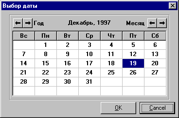Для удобства ввода даты создана форма «Выбор даты» (Рис7.10). Правые верхние кнопки отвечают за выбор месяца, а левые верхние кнопки отвечают за выбор года.