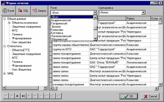 Данная форма состоит из двух основных элементов: дерева отчетов и сетки вывода запроса. Для удобства поиска данных предусмотрен выпадающий список «Поле» который ограничивает запрос выбранным параметром. Так же предусмотрена сортировка по любым полям таблицы. Данные два поля позволяют создавать с помощью одного запроса комбинацию запросов по выбранным критериям.