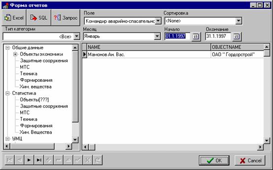 Одна из самых главных форм - эта форма отчетов, которая позволяет выбрать любые данные, практически по любым критериям, из базы данных. (Рис 7.11).