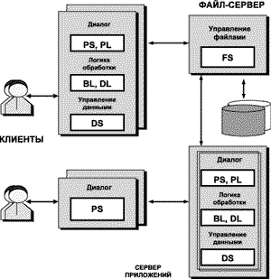 В отличии от централизованной системы архитектура "файл-сервер" (таблица 3.1 и рисунок 3.1) не имеет сетевого разделения компонентов диалога PS и PL, использует ПК для функций отображения, что облегчает построение графического интерфейса. Файл-сервер только извлекает данные из файлов, так что дополнительные пользователи и приложения добавляют лишь незначительную нагрузку на ЦП. Каждый новый клиент добавляет вычислительную мощность к сети.