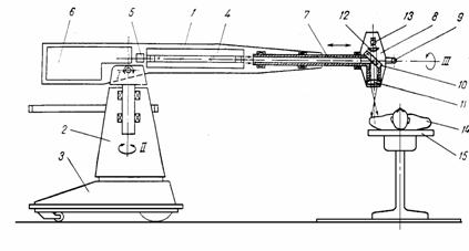 Операционный аппарат состоит из горизонтального ствола 1, установленного на вертикальной стойке 2. Ствол может поворачиваться вокруг горизонтальной оси I и вертикальной оси II.