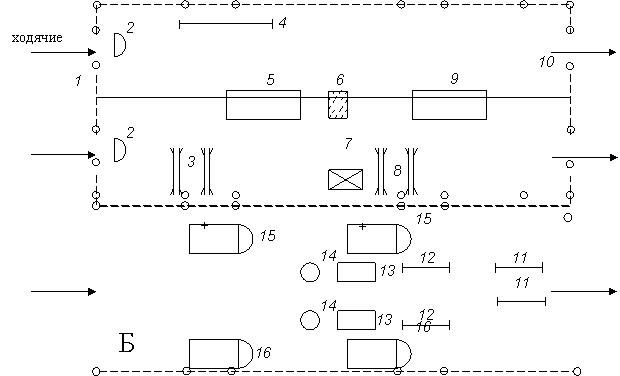 А – площадка санитарной обработки; Б – площадка специальной обработки транспорта и носилок; 1– ящик для сбора оружия; 2– прорезиненные мешки для сбора зараженного обмундирования, средств защиты (НПП, РДП–48, часть комплекта НДПС–69, ванночки с мыльным раствором, тампоны); 3 – место для частичной санитарной обработки носилочных пораженных; 4 – стойка с вешалками для дезактивации обмундирования; 5 – стол для противохимических средств; 6 – яма для сбора использованных тампонов, ветоши; 7 – ящик для обменного фонда белья и обмундирования; 8 – место для снятия средств защиты органов дыхания и надевания незараженного белья и обмундирования; 9 – стол для антидотов; 10 – умывальник; 11 – место для чистых носилок; 12 – место для специальной обработки носилок и медицинского имущества; 13 – комплект для специальной обработки военной техники ДК–4; 14 – емкости для дегазирующих и дезактивирующих растворов; 15 – место для обработки санитарного транспорта; 16 – место для обработки машин подвоза (грузового транспорта).