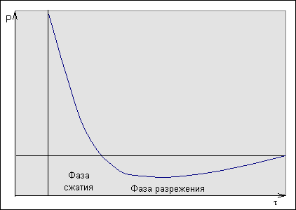 Перед фронтом ударной волны давление в воздухе равно атмосферному Р0. С приходом фронта ударной волны в данную точку пространства давление резко (скачком) увеличивается и достигает максимального, затем, по мере удаления фронта волны, давление постепенно снижается и через некоторый промежуток времени становится равным атмосферному. Образовавшийся слой сжатого воздуха называют фазой сжатия. В этот период ударная волна обладает наибольшим разрушающим действием. В дальнейшем, продолжая уменьшаться, давление становится ниже атмосферного и воздух начинает двигаться в направлении, противоположном распространению ударной волны, то есть к центру взрыва. Эта зона пониженного давления называется фазой разрежения.