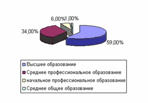Административно-управленческий персонал (АУП) необходимо проверить на соответствие фактического уровня образования каждого работника занимаемой должности и изучить вопросы, связанные с подбором кадров, их подготовкой и повышением квалификации. Анализ сотрудников предприятия по уровню образования АУП показал, что основной состав персонала представлен работниками с высшим образованием 59%, это в основном начальники подразделений, служб, специалисты, инженеры. Доля работников, имеющих среднеспециальное образования, составила 34%, это мастера, техники, бухгалтера. Работники, имеющие профессиональное образование, составляют 6%, это диспетчера, работники бухгалтерии. Общее среднее образование имеет 1% АУП – это, в основном, паспортисты (Рис.5).