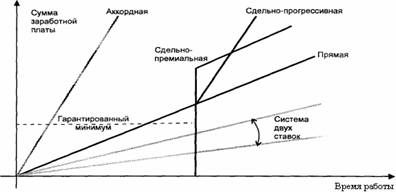Рис 2. Зависимость заработной платы от количества времени при отдельных формах оплаты труда.