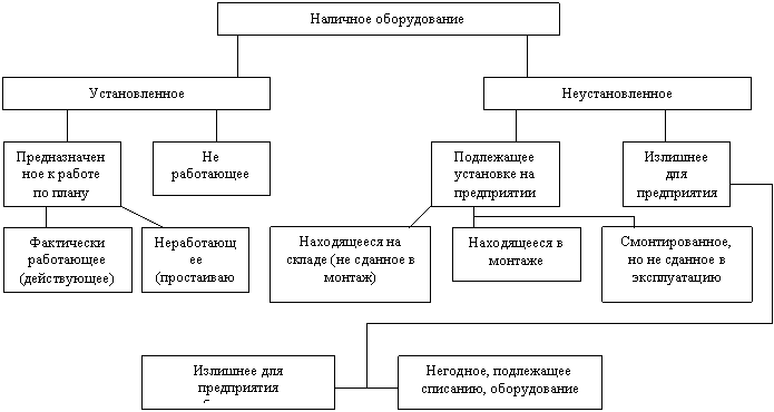 Оборудование включает соответственно следующие главные составляющие: наличное, установленное и действующее. К наличному относится все имеющееся на предприятии оборудование не зависимо от того, где оно находится (в цехах, на складе) и в каком состоянии, к установленному - смонтированное и подготовленное к работе оборудование, находящееся в цехах, причем часть установленного оборудования может быть в резерве, на консервации, в плановом ремонте, модернизации. Действующее оборудование - это фактически работающее в отчетном периоде оборудование независимо от продолжительности.