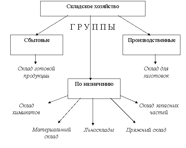 Количество складов зависит от категории предприятия, объема и номенклатуры потребляемых материалов. Структуру складского хозяйства льнокомбината можно изобразить в виде схемы (см. схему С. )