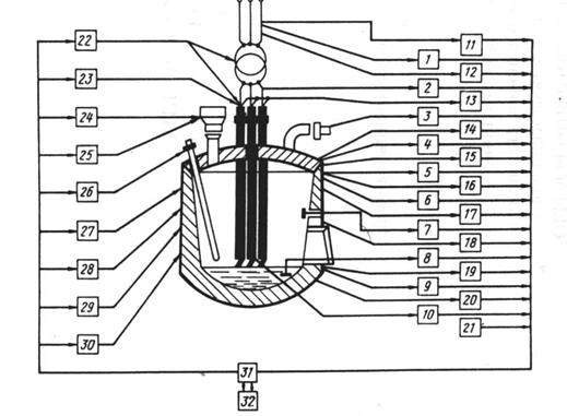 1 — устройство для измерения расхода активной энергии; 2 — устройство для измерения среднеквадратичных токов; 3 — устройства для измерения расхода, температуры и состава отходящих газов; 4 — устройство для измерения положения кислородной фурмы; 5 — устройство для определения состава стали и шлака; 6 — устройство дли измерения расхода газа и кислорода на горелки; 7 — устройство для измерения температуры футеровки; 8 — устройство для измерения температуры металла в ванне печи; 9 — устройства для измерения расхода, давления и температуры воды; 10 - устройство для измерения положения электродов; 11 — устройство для измерения расхода реактивной энергии; 12 — устройство для измерения коэффициента мощности; 13 — устройства для измерения активной и реактивной мощности; 14 — устройства для измерения расхода, давления и количества кислорода; 15 — устройство для взвешивания ферросплавов; 16 — устройство для измерения перепада температур воды на входе и выходе охлаждаемых элементов; 17 — устройство для измерения давления и расхода газа; 18 — устройство для взвешивания металлизованных окатышей; 19 — весы для взвешивания скрапа; 20 — устройство для взвешивания шлакообразующих и заправочных материалов; 21 — устройство для взвешивания жидкого металла в ковше; 22 — система автоматического управления (САУ) электрическим режимом; 23 — регулятор мощности; 24 — САУ весовым дозированием металлизованных окатышей; 25 — САУ весовым дозированном ферросплавов и шлакообразующих; 26 — САУ продувкой ванны кислородом; 27 — система регулирования давления газов под сводом печи; 28 — САУ весовым дотированием компонентов металлошихты; 29 — САУ химическим составом металла и шлака; 30 — система измерения времени плавки и технологических интервалов; 31 — система сбора и обработки информации; 32 — УВМ.