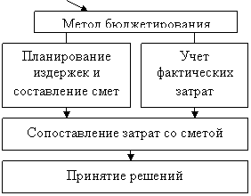 Во втором случае бюджетирование как способ управления затратами предусматривает составление бюджетных смет по различным направлениям деятельности и в целом по подразделениям. Здесь производственные затраты сравниваются с предусмотренными расходами сметой (планом). Сметный метод контроля широко используется по местам и центрам затрат, по которым трудно или невозможно установить конкретный результирующий показатель деятельности. Это отделы управления, подготовки производств.