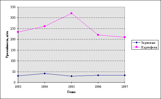 Вышеприведенные данные свидетельствуют о том, что на протяжении последних пяти лет урожайность сельскохозяйственных культур находится на достаточно высоком уровне. Однако, за анализируемый период произошло резкое снижение урожайности таких культур, как яровые (на 18,7%), корнеплоды (на33,2% в 1995 году по сравнению с 1993 годом). Но в то же время возросла урожайность кукурузы на силос (в 1,6 раза) и урожайность озимых (на 0,9%). Урожайность картофеля с 1993г. по 1995г. существенно возросла, однако в 1996-1997гг. произошло ее снижение (в 1997г. на 10,4% урожайность картофеля ниже, чем в 1993г.). ОПХ «Минское» специализируется на производстве семян зерновых и картофеля; о том, что у хозяйства имеется большой потенциал к увеличению урожайности свидетельствует вышеприведенная таблица.
