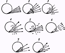 Длина искры зависит от силы надавливания на вращающийся диск и, стало быть, добиться одинаковой длины искры можно, определив степень и равномерность надавливания и ее сохранять во время испытаний. Неравномерное давление образца на круг может дать искаженный результат. При образовании искры следует внимательно наблюдать за длиной искры, ее количеством, окраской и характером звездочек (рис. 31).