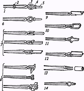 Рис. 38. Виды кузнечных клещей: 1 - рукоятка; 2 - зажимное кольцо (шпандырь); 3 - заклепка; 4 - губки; 5 - заготовка; 6 - продольно-цилиндрические; 7 - продольно-прямоугольные; 8 - поперечно-прямоугольные; 9 - угольные; 10 - кольцевые; 11 - для топоров; 12 - тавровые; 13 - для захвата цилиндра изнутри; 14 - прутково-поперечные