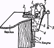 Рис. 39. Стуловые тиски: 1 - неподвижная губка; 2 - крепежная планка; 3 - нижний стержень; 4 - шарнир; 5 - рукоятка; 6 - пружина; 7 - подвижная губка.