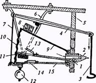 Рис. 50. Меха: 1 - голова; 2 - сопло; 3 - рукоятка; 4 - коромысло; 5 - стенка горна; 6 - стойка; 7 - тяга; 8, 12- грузы; 9, 11, 15 - доски; 10 - кожаная гармошка; 13, 14 - клапаны Голова - основная часть мехов. К ней прикреплены три клиновидные доски: верхняя и нижняя шарнирно, а средняя - жестко. Нижняя и средняя доски имеют клапаны для забора воздуха, это куски кожи, прибитые одной стороной к доскам, перекрывающие круглое отверстие в нижней и средней доске. Сверху над кожей прибит ремешок, ограничивающий подъем клапана. Кожаная гармошка соединяет верхнюю и нижнюю подвижные доски со средней неподвижной. Гармошка состоит как правило из трех отделенных складок, каждая из которых соединяется с внутренним деревянным каркасом, по форме совпадающим с периметром досок. Кожа прибивается к каркасу через тонкие ремешки, чтобы гвоздь не прорвал кожу.