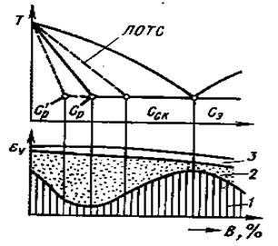 Впервые общая схема распределения усадочных пустот между раковиной и порами, в зависимости от DТкр была приведена в работах А.А. Бочвара. Последующие исследования уточнили зависимость с учетом положения ЛОТС (или точки Сск.) и неравновесного солидуса. Максимум развития пористости фиксируется при концентрациях вблизи точек Ср или С’р (см. рис. 1).