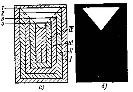 В начале затвердевания образуется контурная корка 1 (рис. 3, а). В связи с тем, что объем возникшей твердой фазы меньше объема жидкости, затраченной на образование корки, уровень жидкости внутри слитка понижается до горизонтали 1. В следующий период времени затвердевает слой II, причем усадка, происходящая при кристаллизации, компенсируется понижением зеркала жидкости до уровня 2. В дальнейшем при затвердевании слоев 111 и Ю уровень жидкости понижается соответственно до горизонталей 3 и 4.