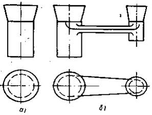 Естественно, что отливка с усадочной раковиной в сечении в большинстве случаев непригодна к употреблению, так как её прочность и некоторые другие служебные качества (например, герметичность) резко снижаются. Поэтому при изготовлении отливок стремятся вывести усадочную раковину в специальный дополнительный объем,. который добавляют к рабочему телу отливки, изменяя таким образом ее конфигурацию. Этот объем, называемый прибылью, затем отрезают. На рис.5,а дана простейшая цилиндрическая отливка (слиток) с прибылью, на рис. 5,б – фасонная отливка с двумя прибылями