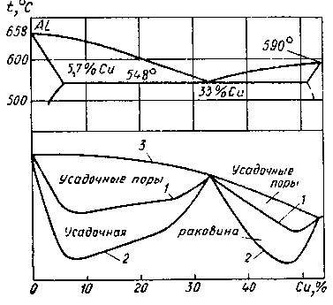 Таким образом, при литье сплавов, затвердевающих в интервале температур, в отливке одновременно образуются и усадочные раковины и усадочные поры. Распределение общего объема усадочных полостей между раковинами и порами можно рассчитать по соотношению объемов плотного и пористого металлов. Это соотношение, зависит от эффективной величины интервала кристаллизации сплава и интенсивности охлаждения отливки. На рис. 6 дан график, характеризующий относительные объемы усадочных раковин и усадочных пор, выраженные в долях общего объема усадочных полостей, которые образуются в бинарных алюминиево-медных сплавах разного состава.