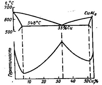 Герметичность сплавов изучали следующим образом.: Из отдельных сплавов; относящихся к бинарной системе Аl – Сu, отливали плоские пластины толщиной 30 мм. Во всех случаях перед заливкой сплав перегревали на одинаковое число градусов над температурой ликвидуса. Все отливки охлаждали в идентичных условиях. После охлаждения к одной из сторон пластины подводили керосин под давлением 50 ат. Визуальным наблюдением за противоположной стороной пластины устанавливали, протекает или не протекает керосин сквозь отливку. Если керосин не протекал, на токарном станке с обеих сторон пластины снимали слой толщиной 1 мм и опыт с керосином повторяли. Снятие слоев с обеих сторон пластины и пробу на герметичность повторяли до тех пор, пока на открытой стороне отливки не появлялись мелкие капли керосина (отпотевание). Опыты, в которых обнаруживали течь керосина в виде струи, отбрасывались, так как это указывало на наличие трещин в сплаве. Полученные при экспериментах результаты иллюстрирует рис. 7.