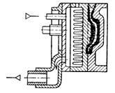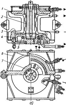 В зависимости от способа охлаждения различают кокили с воздушным (естественным и принудительным), с жидкостным (водяным, масляным) и с комбинированным (водо-воздушным и т. д.) охлаждением. Воздушное охлаждение используют для малотеплонагруженных кокилей. Водяное охлаждение используют обычно для высокотеплонагруженных кокилей, а также для повышения скорости охлаждения отливки или ее отдельных частей. На рис. 2.6 представлен кокиль с воздушным охлаждением. Ребра на стенках кокиля увеличивают поверхность соприкосновения охладителя — воздуха — с кокилем и соответственно теплоотвод. На рис. 2.7 представлен водоохлаждаемый кокиль для отливки барабана шахтной лебедки из высокопрочного чугуна. Вода подается раздельно в обе половины кокиля, нижнюю плиту и верхнюю крышку.