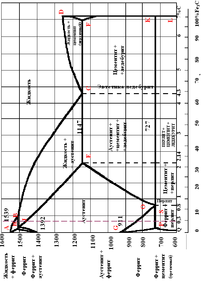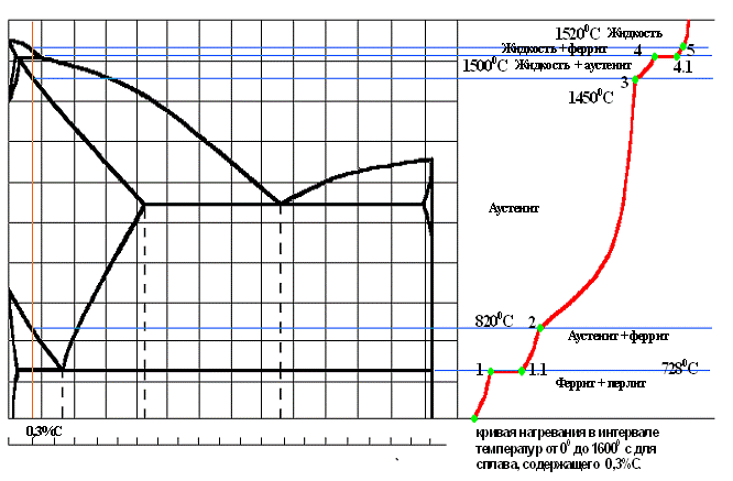 1.1 Вычертите диаграмму состояния железо – карбид железа, спишите превращения и постройте кривую нагревания в интервале температур от 00 до 16000 /с применением правила фаз / для сплава, содержащего 0,3%С.