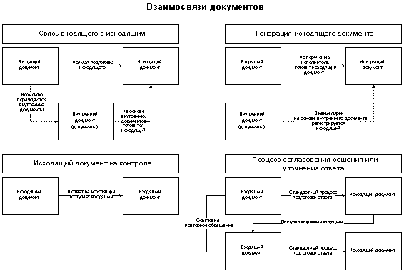 Без связей как таковых могут появляться только внутренние и входящие документы. Причем входящие документы могут иметь связи как на исходящие, которые вызывают их появление, так и на другие входящие (см. “Процесс согласования или уточнения ответа” на рис. 1). Все документы связаны как в системе управления документами, так и в системе контроля исполнения (как принадлежащие одной работе). В этом смысле здесь наблюдается некоторое дублирование связей.