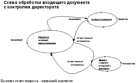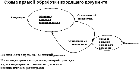 В данном разделе переходим от великой статики к динамике документов, т.е. вместе с рассмотрением самих документов приступаем к рассмотрению процессов обработки документов. Основным процессом канцелярии является прохождение по предприятию входных документов. Канцелярия отвечает за сроки исполнения входных документов, точнее выполняет фискальные функции: кто и когда задержал выполнение документа. При этом существует два основных маршрута прохождения документа: