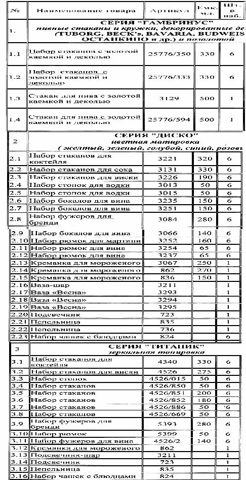 ООО «1000 мелочей» на основе договорной системы работает с многими поставщиками стеклянной посуды: ЗАО «Термопульс» г. Брянск, ОАО «Первомайский стекольный завод» п. Первомайский Смоленской области Шумячского района, ООО Производственное предприятие ИНТЕР-АРТ ХХI г. Тверь, ООО фирма «ДП-Трэйд» г. Москва, АО «Стекольные заводы KAVALIER», ООО «Уралпосуда» Гусь-Хрустальный. Договора, на основании которых осуществляется поставка товара от производителя представлены в работе а приложениях 1 и 2. Рассмотрим ассортиментный перечень поставляемой продукции от поставщиков.
