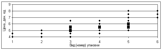 Рис. 3. Диаграмма рассеивания для вида упаковки и цены часов «Электроника»