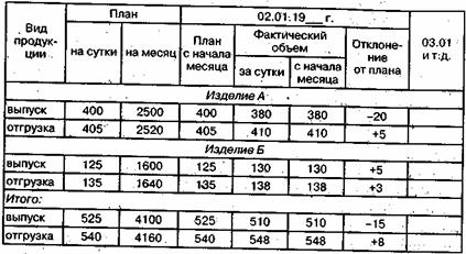 Оперативный анализ производства и отгрузки продукции осуществляется на основе расчета, в котором отражаются плановые и фактические сведения о выпуске и отгрузке продукции по объему и ассортименту за день, нарастающим итогом с начала месяца, а также отклонение от плана