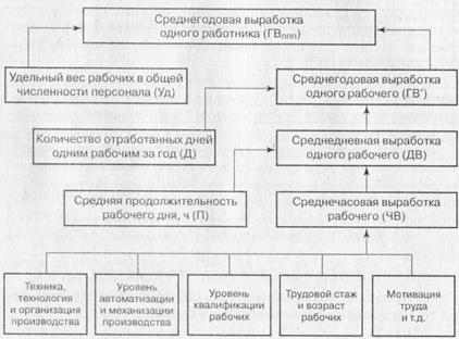 Наиболее обобщающий показатель производительности труда — среднегодовая выработка продукции одним работающим. Его величина зависит не только от выработки рабочих, но и от удельного веса последних в общей численности ППП, а также от количества отработанных ими дней и продолжительности рабочего дня (рис. 2.1).