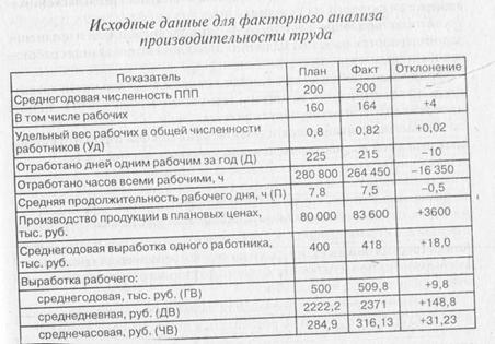 Аналогичным образом анализируется изменение среднегодовой выработки рабочего, которая зависит от количества отработанных дней одним рабочим за год, средней продолжительности рабочего дня и среднечасовой выработки: