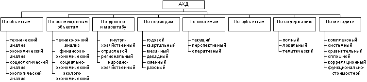 Классификация АХД соответственно отраслевому, временному, пространственному, функциональному признакам, периодичности проведения, объектам управления, методике исследования, полноте охвата объектов, содержанию программы, потребителям анализа.