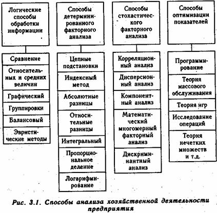 Для изучения влияния факторов на результаты хозяйствования и подсчета резервов в анализе применяются такие способы, как цепные подстановки, абсолютные и относительные разницы, интегральный метод, корреляционный, компонентный, методы линейного, выпуклого программирования, теория массового обслуживания, теория игр, исследования операций, теория нечетких множеств и т.д. (рис. 3.1). Применение тех или иных способов зависит от цели и глубины анализа, объекта исследования, технических возможностей выполнения расчетов и т.д.