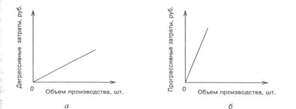 Графики поведения дегрессивных и прогрессивных затрат — совокупных и в расчете на единицу продукции (продаж) — приведены на рис. 5.