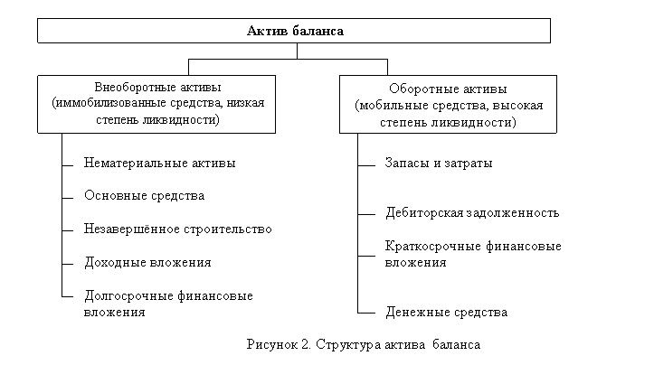 Под активами обычно понимают имущество (ресурсы предприятия), в которое инвестированы деньги. Статьи актива располагают в зависимости от степени ликвидности (подвижности) имущества, т.е. от того насколько быстро данный вид актива может приобрести денежную форму. Разделы актива баланса также строятся в порядке возрастания ликвидности (рисунок 2).