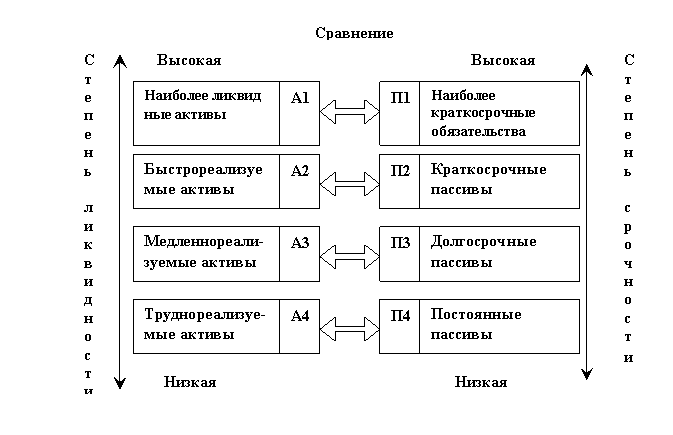 При определении ликвидности баланса группы актива и пассива сопоставляются между собой (рисунок 4). По показателям бухгалтерского баланса соотношения между активом и пассивом могут быть представлены в следующем виде. Условия абсолютной ликвидности баланса: